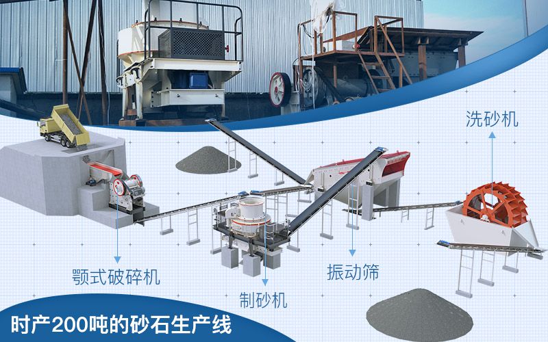综上所述,时产200吨的砂石生产线配置为给料机、皮带输送机、颚式破碎机、反击式破碎机/圆锥式破碎机、制砂机、洗砂机、筛分机等。