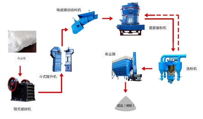 白云石首先经过颚式破碎机细碎之后,送入提升机送到料仓经过底部的电磁振动给料机均匀的送入雷蒙磨粉机,经过研磨,被鼓风机送入选粉机,经过筛选,出来的粉料就是成品。