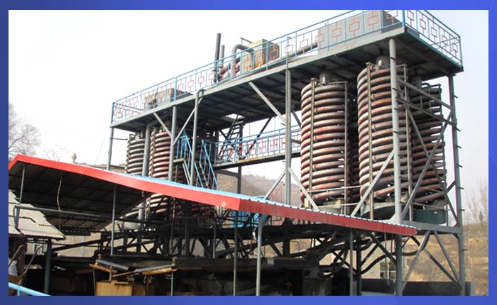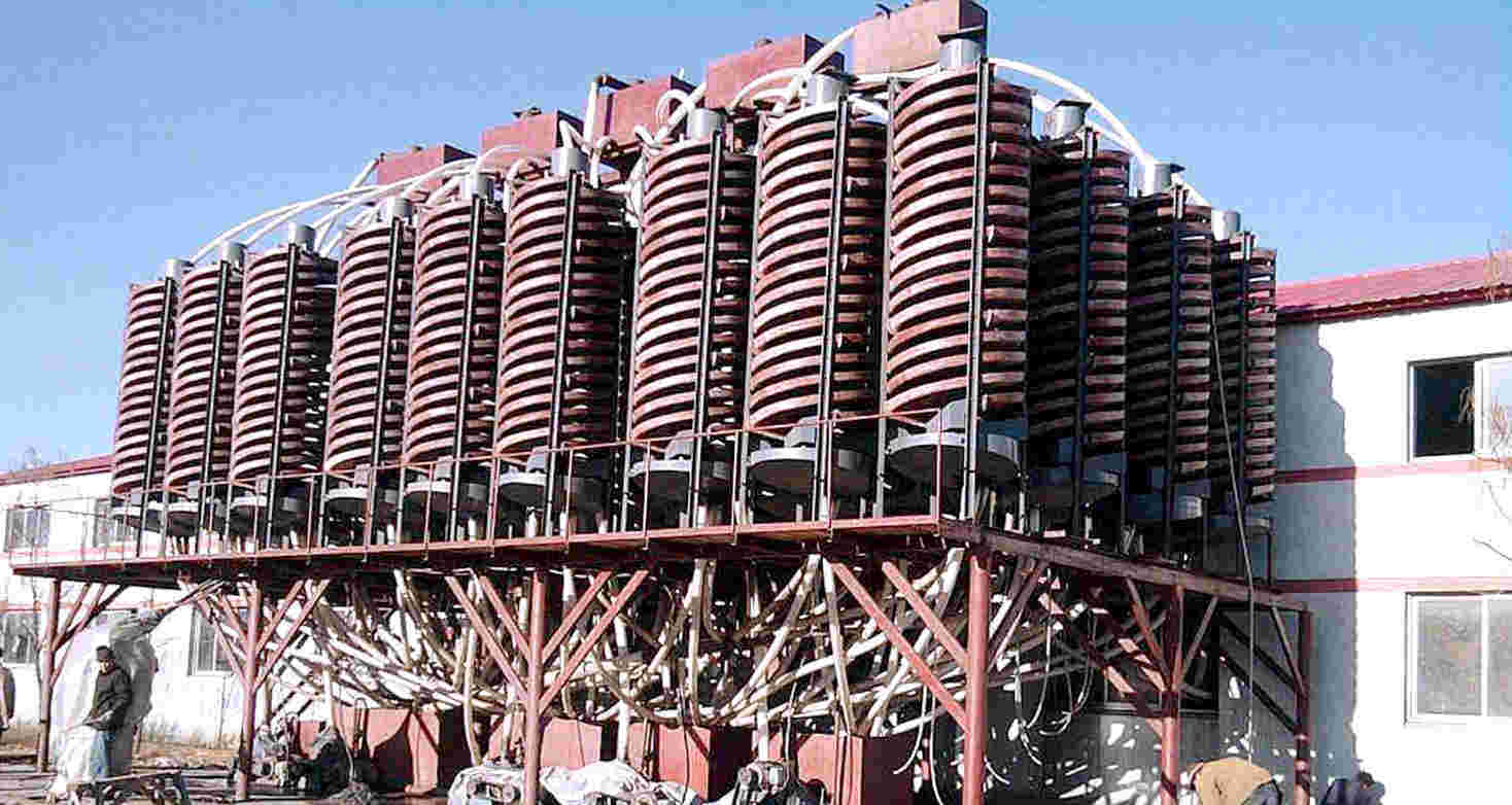 将螺旋溜槽立起,校准垂直线,用铁架或木头固定在合适的位置,由砂泵将矿砂送到螺旋上顶两个进料口处,加入补充水,调节矿桨浓度,矿桨自然从高往下旋流,在旋转的斜面流速中产生一种惯性的离心力,以矿砂的比重、粒度、形状上的差异,通过旋流的重力和离心力的作用,将矿与砂分开,精矿流入精矿斗用管道接出,尾砂流进尾砂斗用管道接到砂池,再用砂泵排走,完成了选矿的全过程。